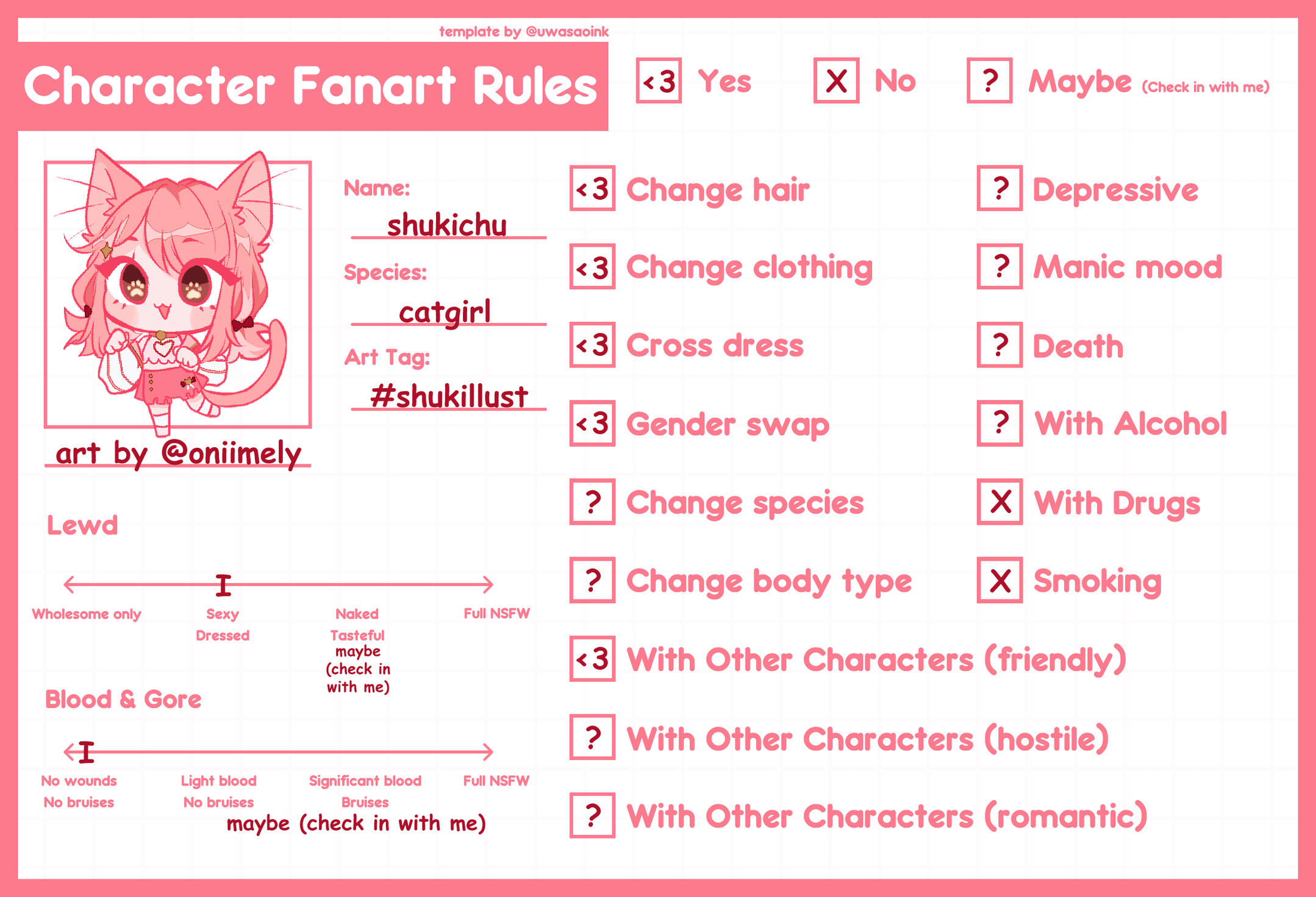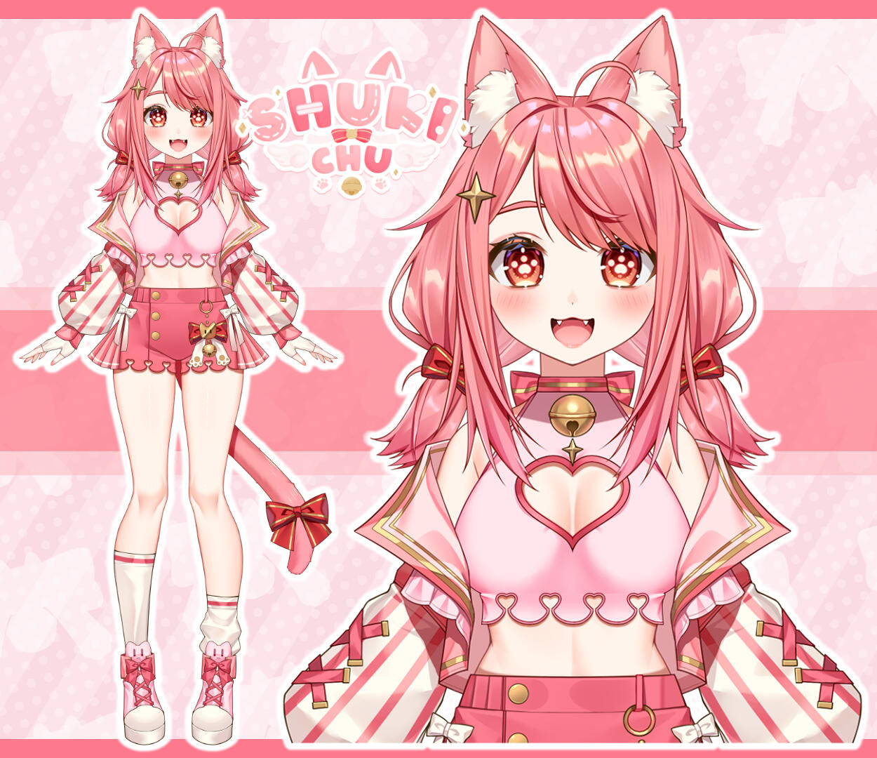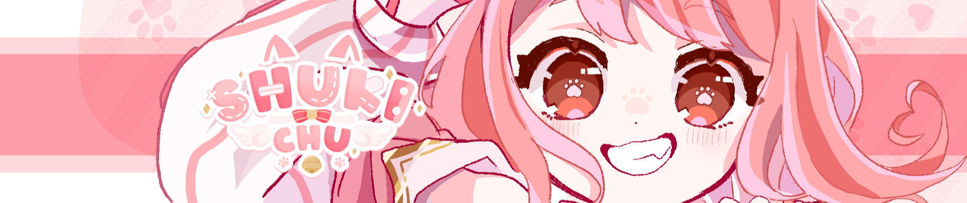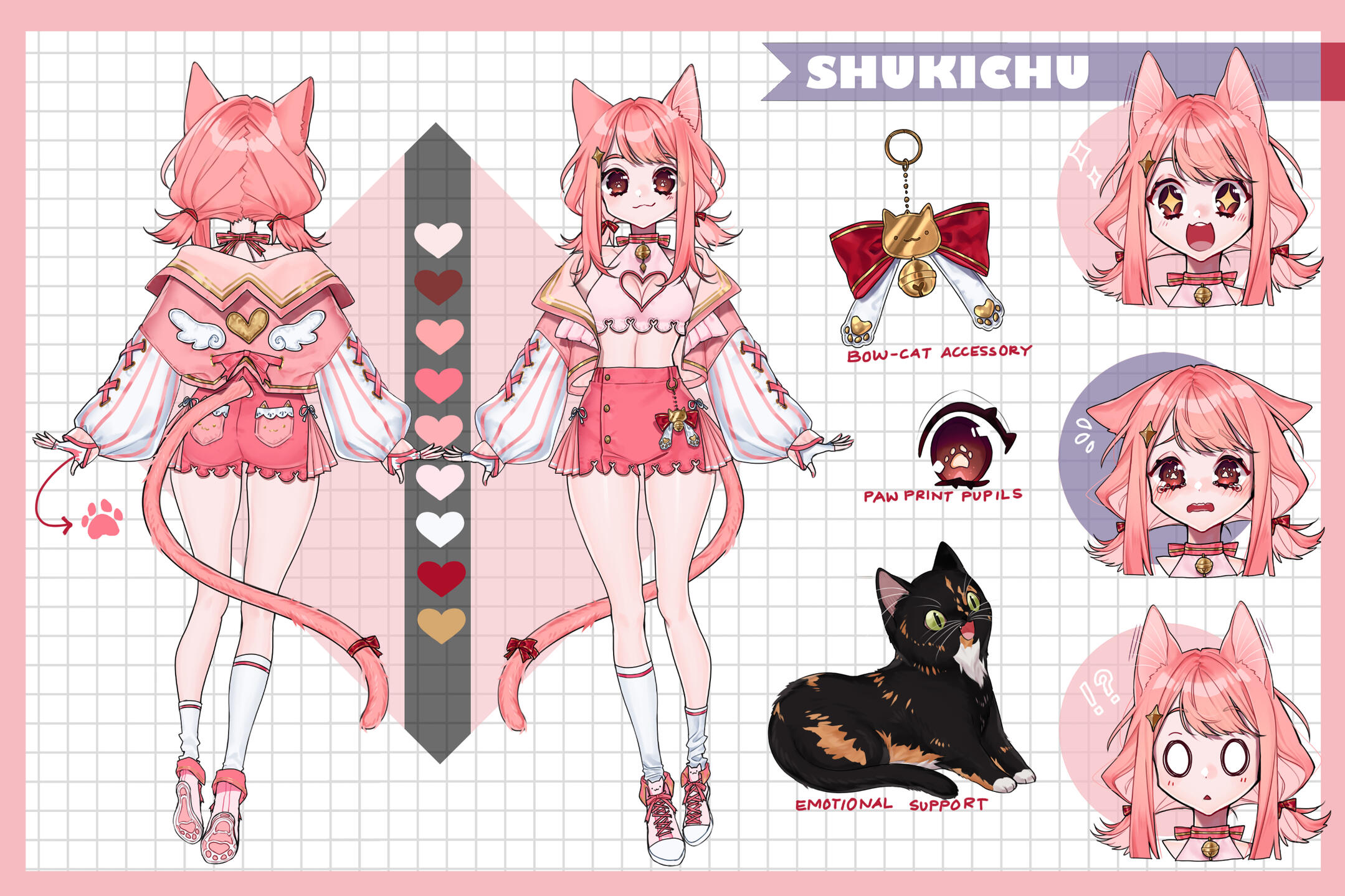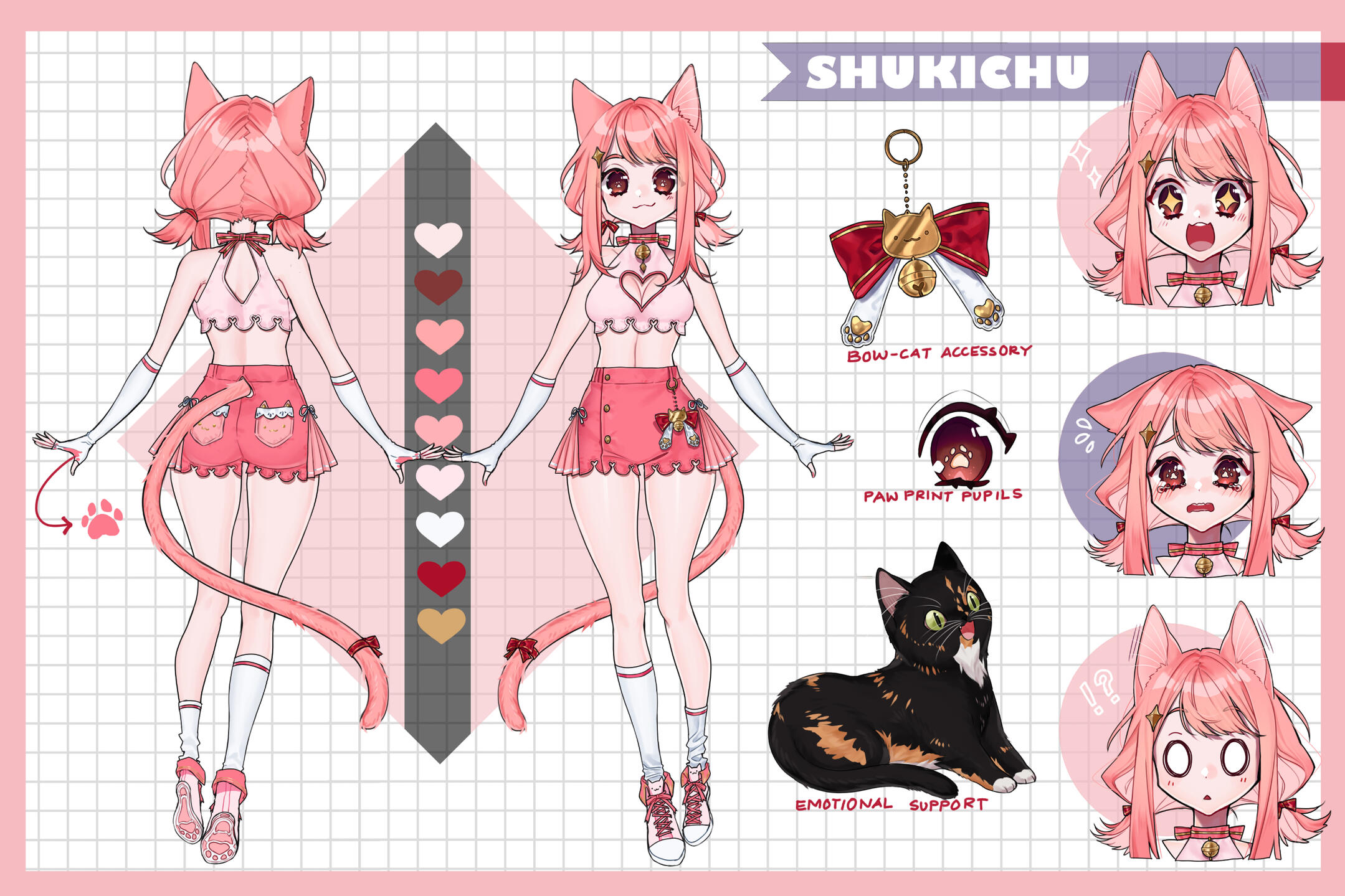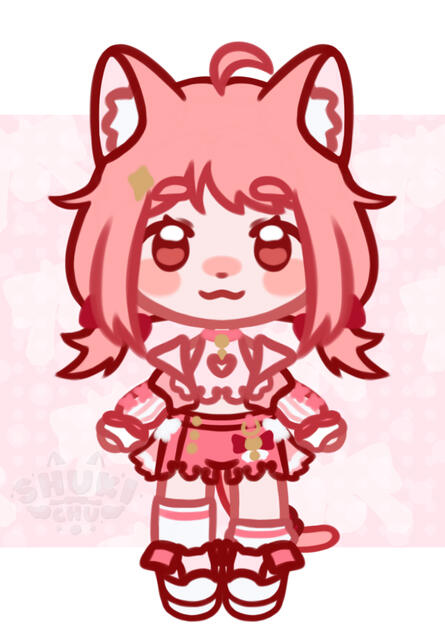 puff out and close back in at the cuff. It is detailed with a pink ribbon forming two Xs on each arm. Suki has a cute pink pair of shorts that end at the upper thigh with heart cutouts at the bottom. Both the heart cutouts from the crop top and shorts help Suki with gliding in the air. They also serve as a reminder to help her stay true to herself no matter what the conclusions of her journeys are~. A portion on each side of the shorts frill into a skirt with a cute white ribbon on top. The back pockets have a small cat face and are laced at the top. Suki wears a pair of under-the-knee white socks with one of the socks pushed down! Suki prefers it that way, and if someone tells her to fix her sock, she will give a small laugh in response. Her outfit finishes with a pair of cute pink and white sneakers with a cat head on the top flap and pink paw prints on the bottom. They help her bounce higher than others and gain air space.Friends: Suki’s streams have brought in a lovely and amazing community, thus allowing her to create friends along the way! Whether friendship was formed through a video game rivalry, an art contest, or her interactions with the community, these friends are now held dear to Shukichu. Through Suki's animal-saving adventures, some of the cats she rescued decided to hang around her home. These feline friends offer protection from any vermin or rodent attempting to hijack Suki’s cozy abode. She later named this group of cats her mods to show Suki's gratitude towards them.
